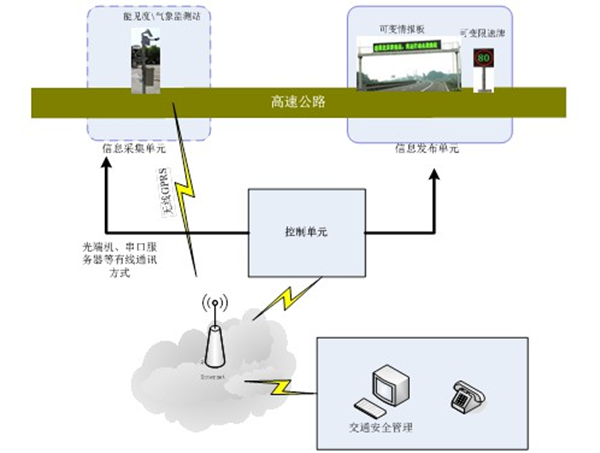 可依托高速公路上已安裝的可變限速標志,根據不同路段檢測的能見(jiàn)距離,實(shí)時(shí)控制各限速標志的限速值,這樣系統不但可及時(shí)提醒駕駛員注意前方大霧,還可向駕駛員安全速度。